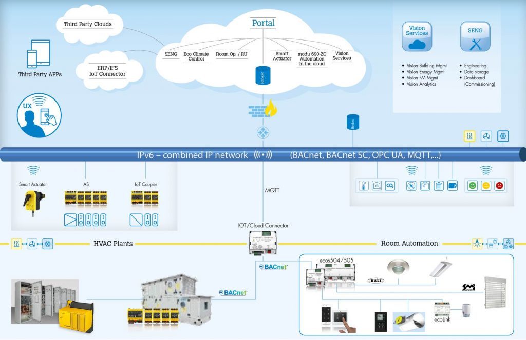 Zadania w zakresie optymalizacji na wyższym poziomie, kontroli i regulacji są wykonywane w sposób bezpieczny i niezawodny w chmurze. Złącze IoT dla chmury oferowane przez firmę SAUTER z MQTT oraz modulo 6 zapewniają linki do lokalnej, fizycznej instalacji. W ten sposób lokalne automatyczne stacje mają mniej do zrobienia i korzystają z elastycznie skalowalnej mocy i pamięci komputerowej.